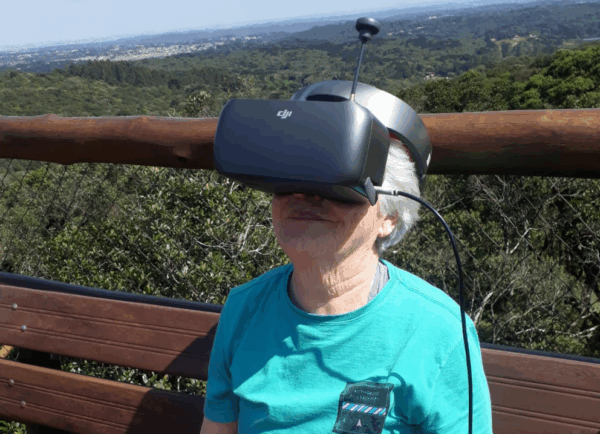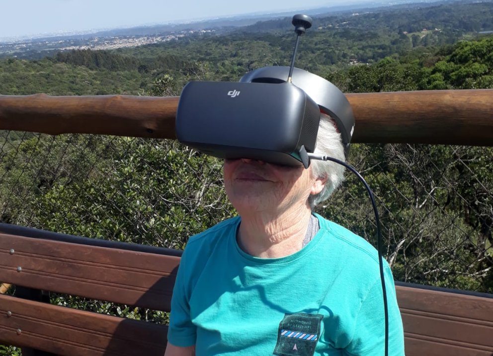 Óculos-visor permanece conectado ao controle remoto do drone, permitindo visualização em tempo real das imagens captadas em voo. Fotografia: Acervo do OO