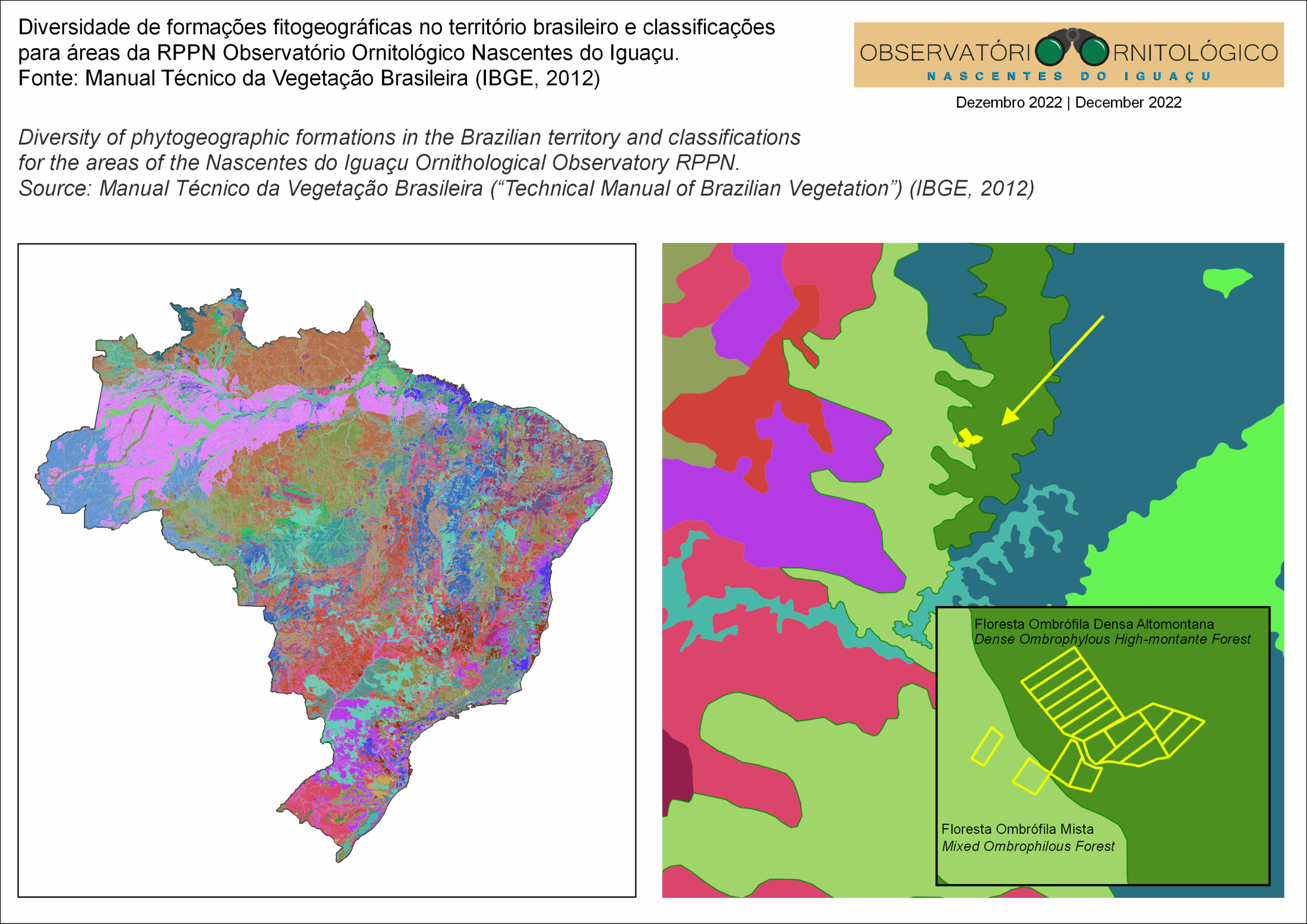 A partir da classificação vegetal dada pelo Instituto Brasileiro de Geografia e Estatística (IBGE) para caracterização das subformações fitogeográficas [1], nas áreas do Observatório Ornitológico encontram-se zonas de Floresta Ombrófila Densa Altomontana e de Floresta Ombrófila Mista. Nos mapas do IBGE, não há detalhamento de subformações da Floresta Ombrófila Mista [2]. Porém, devido à localização entre altitudes de 400m a 1.000m, a literatura científica permite deduzir que as áreas do Observatório nesta subformação possam ser classificadas como Floresta Ombrófila Mista Montana [1].