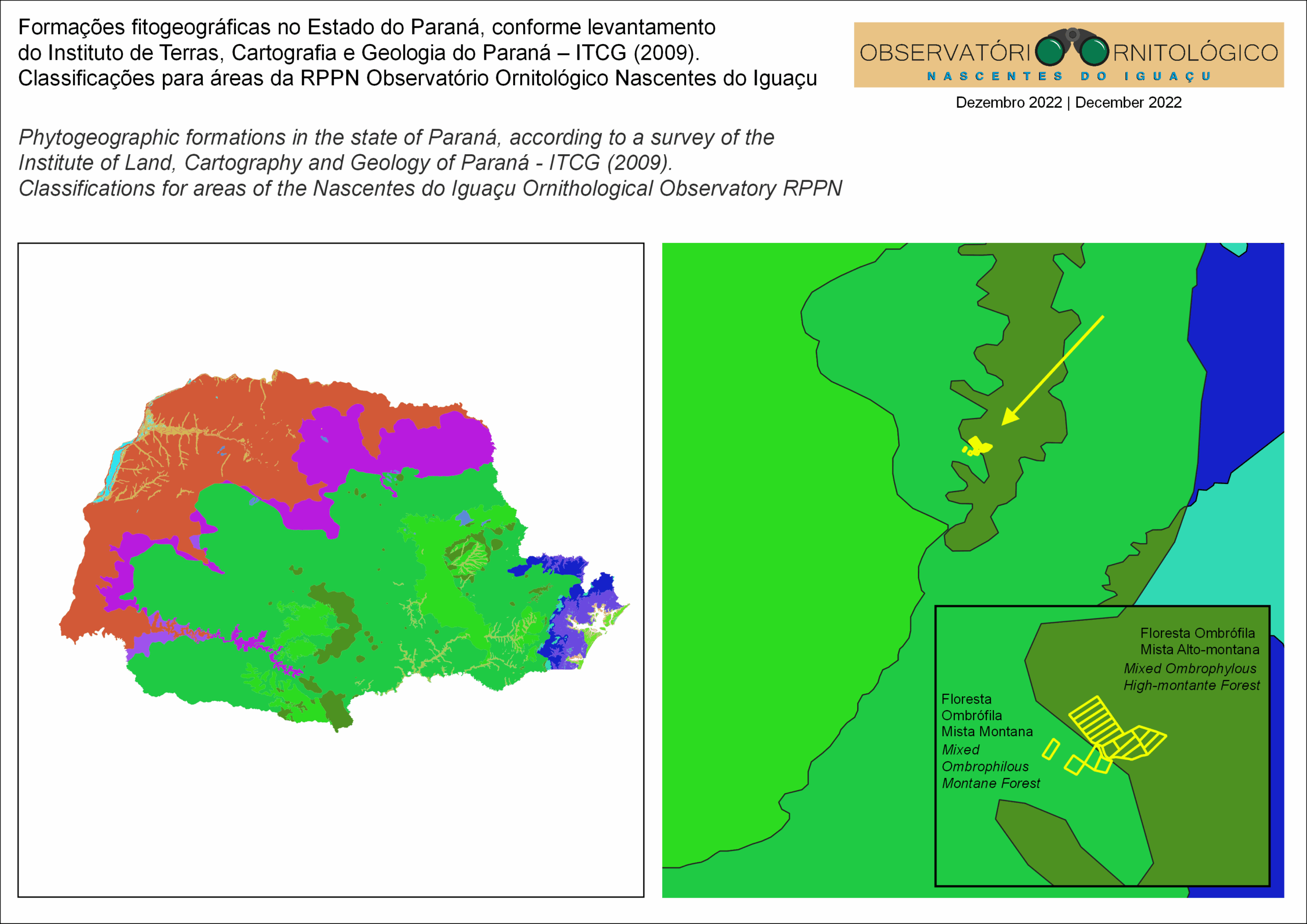 Por outro lado, o antigo Instituto de Terras, Cartografias e Geociências (ITCG), hoje parte da estrutura do Instituto Água e Terra (IAT) no Paraná, classifica as áreas onde se situa o Observatório como Floresta Ombrófila Mista Altomontana e Floresta Ombrófila Mista Montana [3]. O trabalho do ITCG foi feito com base nas publicações do naturalista e geólogo Reinhard Maack. Em 1950, este pesquisador publicou o primeiro mapa fitogeográfico do Paraná.